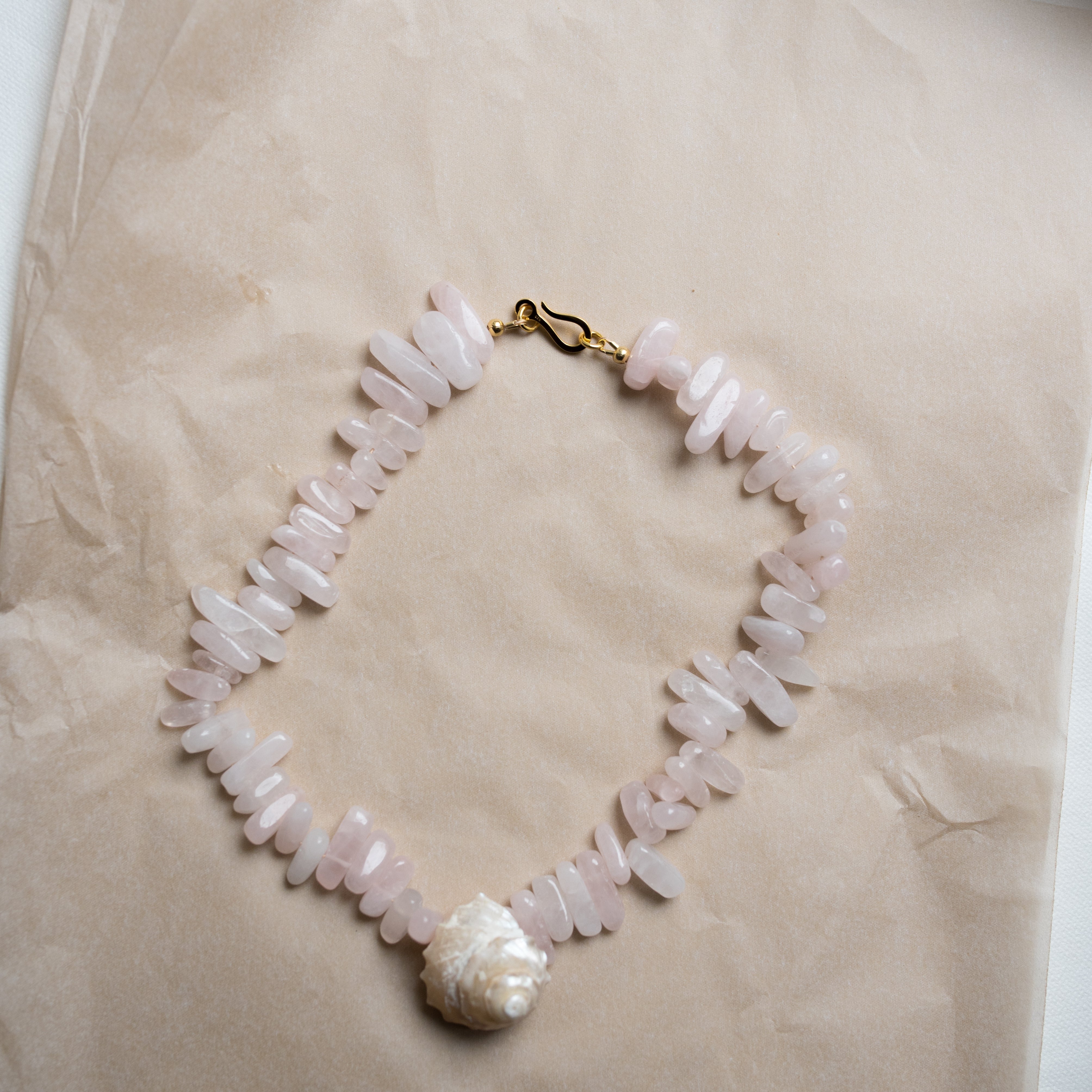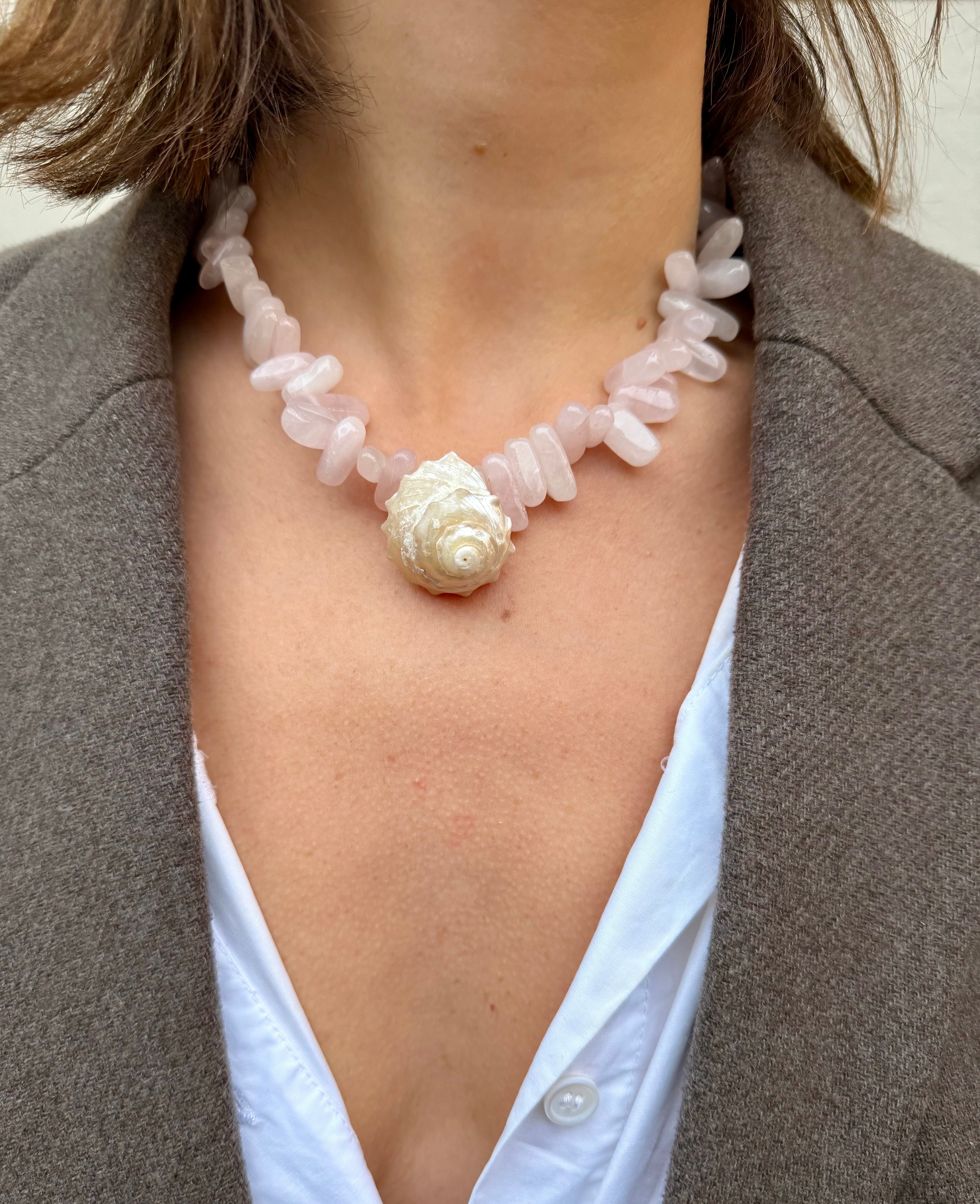 Ein Stück voller Sanftheit und Ausdruck – die Rose Quartz Necklace vereint zartroséfarbene Rosenquarz-Steine mit einer echten Muschel als Detail.