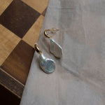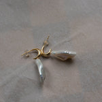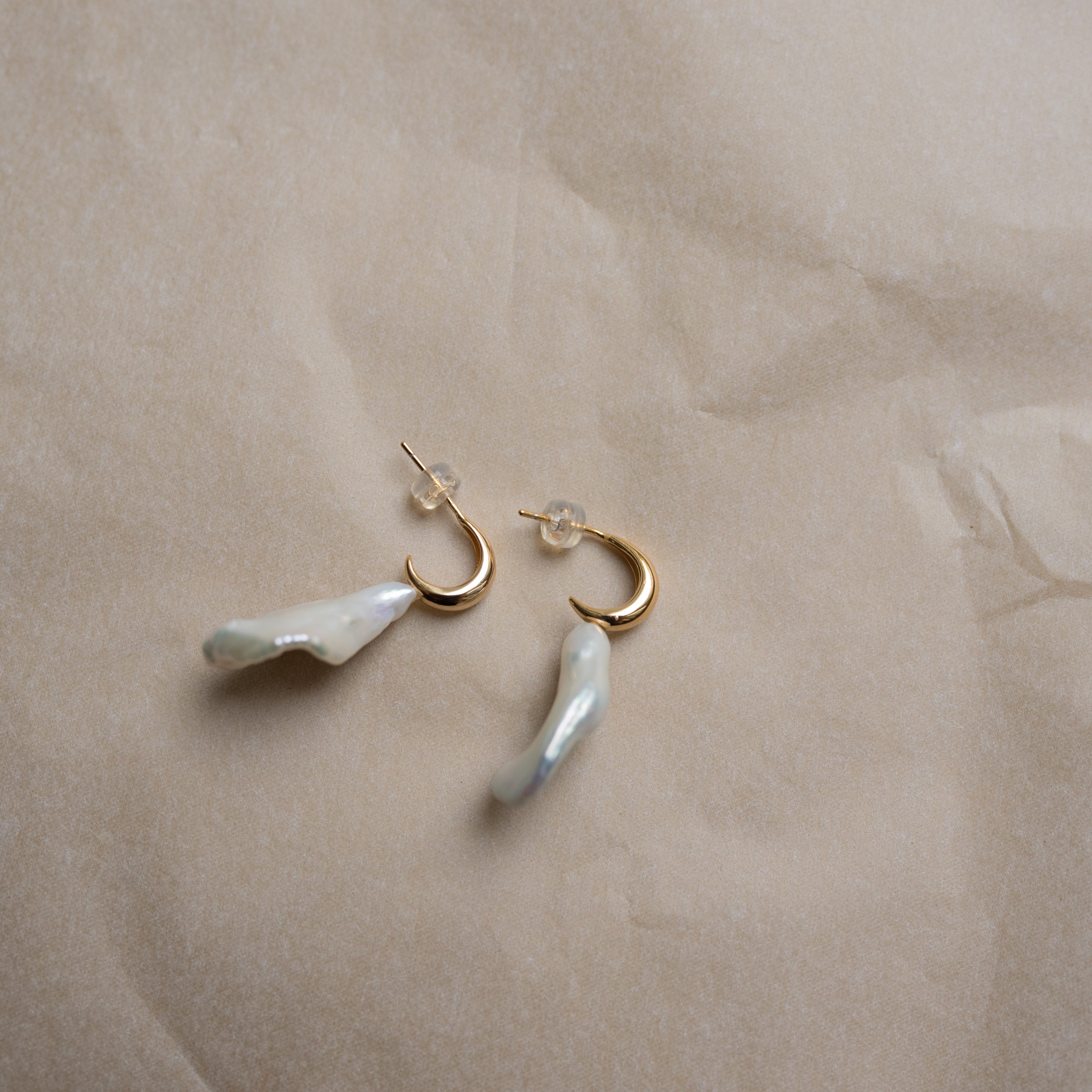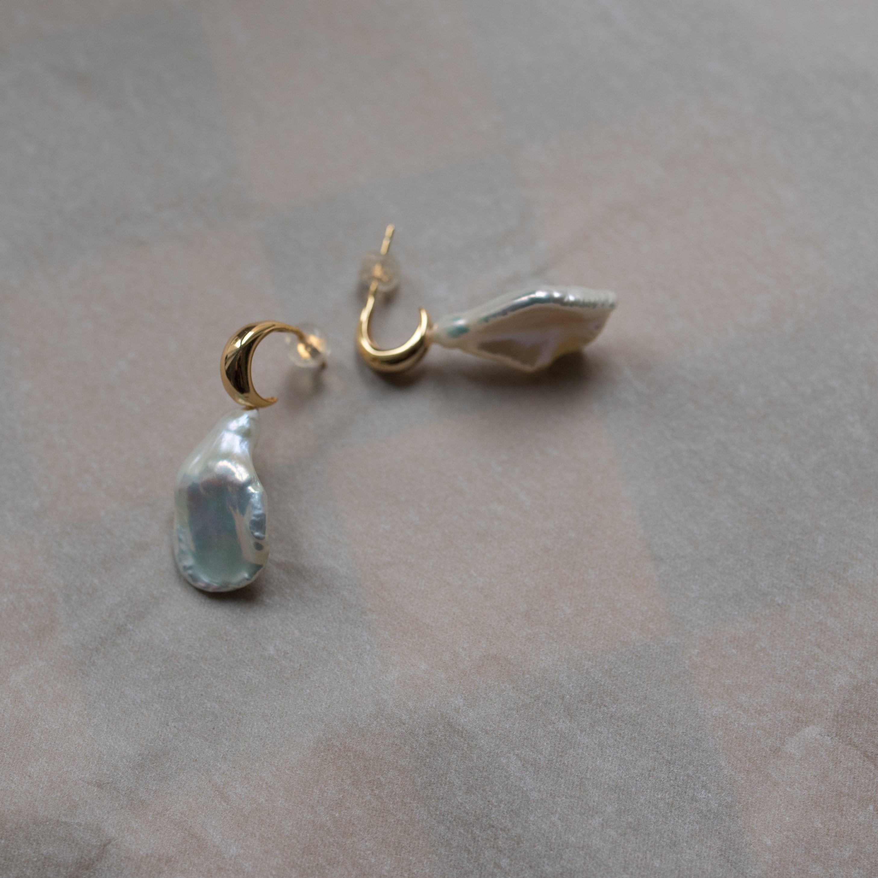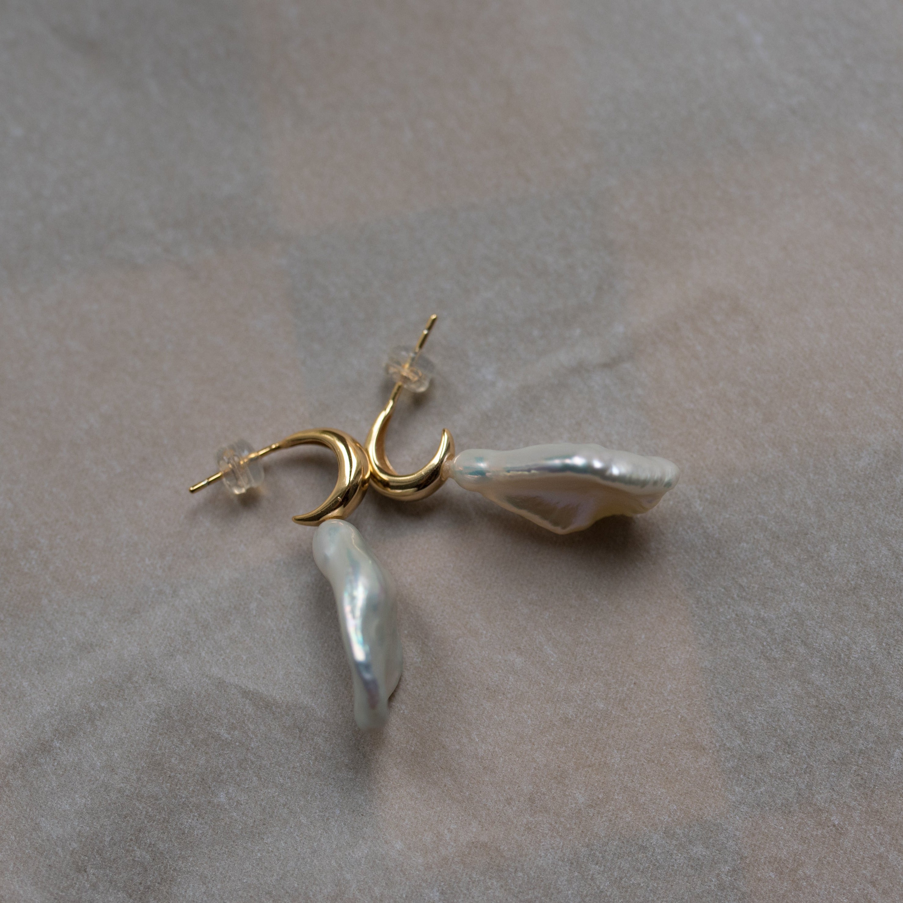 Jedes Paar ist ein handgefertigtes Unikat. Die unregelmäßige Form der Keshi-Perlen reflektiert das Licht in weichen, irisierenden Nuancen – wie Mondschein auf Wasser. Der Halbmond-Ohrring aus vergoldetem Sterling Silber verleiht dem Design eine moderne, minimalistische Note.